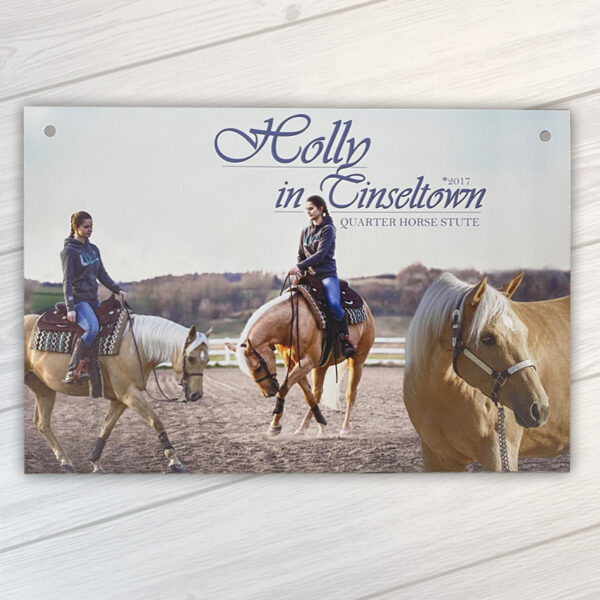 In unserem “Turnierschild” kombinieren wir 2-3 Bilder deines Vierbeiners mit den Informationen, die du gerne auf deinem Schild haben möchtest. Damit dein neues Turnierschild zum echten Hingucker wird, achte bei der Bildauswahl auf eine ähnliche Lichtstimmung der Fotos. Gerne kannst du uns auch 4-5 Bilder zusenden und wir schauen, welche Kombination am besten geeignet ist.